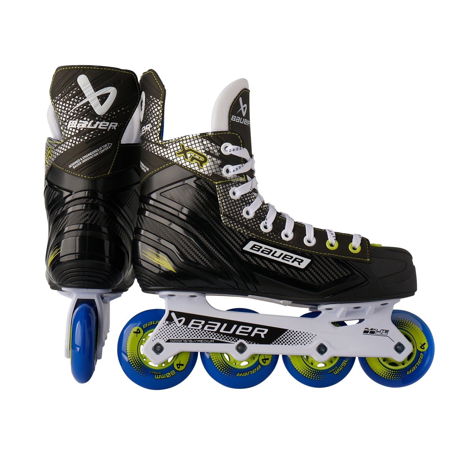 Der BAUER XR besticht nicht nur mit seinen Features, sondern auch mit seinem neuen sportlichen Design mit blauen und gelb-grünen Elementen. Das strapazierfähige Comp-Außenmaterial sowie das Mikrofaser-Innenmaterial garantieren nicht nur eine lange Lebensdauer, sondern auch einen hohen Tragekomfort. Das leichte und robuste BAUER Flexlite Chassis gewährleistet eine optimale Kraftübertragung. Um gute Gleiteigenschaften auf sämtlichen Untergründen zu bieten, ist der Schuh mit hochwertigen Street-Rollen und ABEC-5 Kugellagern ausgestattet.